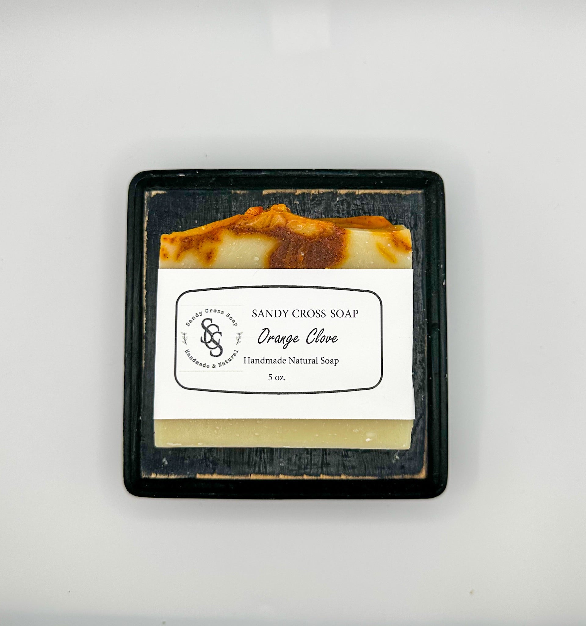 Orange Clove is made with base oils such as coconut, olive oil, castor oil, and sweet almond oil which are good for moisturizing the skin. Sweet orange essential oils are good for reducing wrinkles, fine lines as well as some dark spots. Clove essential oil is an antibacterial that helps to decrease body odors. All bars are hand cut and approximately 5oz.
